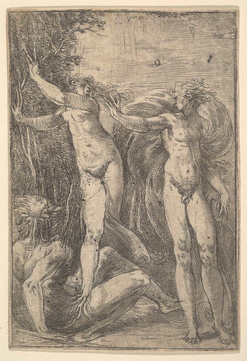Schiavone learned to etch by studying the prints of Parmigianino, the first Italian artist to realize the medium's potential for approximating the spontaneity of drawing. Even more experimental and loose in his approach than his mentor, Schiavone created a number of lively depictions of mythological scenes. Here, the seeming swiftness of his line conveys Daphne's transformation where her fingers turn into branches and her toes root into the ground beside her father, the river god Peneus.
