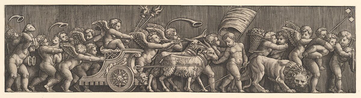 - Title: A frieze arrangement depcting the Triumph of Love; Cupid in a Chariot led by goats, many other putti filling the composition