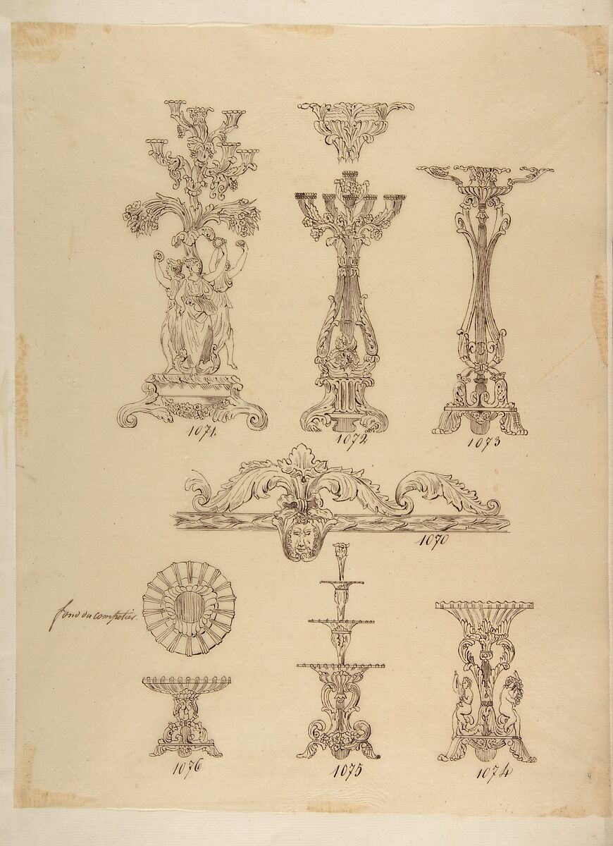- Title: Designs for Three Candelabras, Two Fruit Dishes and a Server