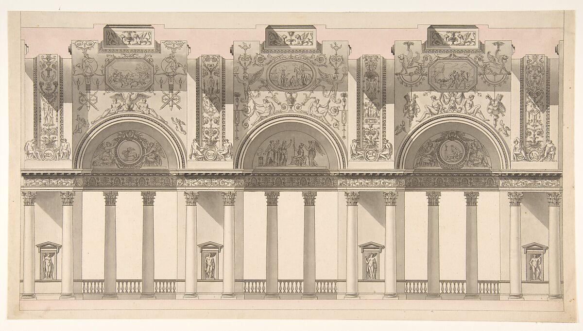 Among the architectural drawings donated by Charles and Jayne Wrightsman are many so-called projets. They represent highly finished ideas for monumental buildings, conceived either in an academic environment or for a specific architectural competition, such as the Grand Prix de Rome. Although most of these projets were never realized, they were of great importance for the training and careers of architects in late eighteenth-century France, allowing them to demonstrate their skills in draftsmanship and design and to exhibit their ideas. Like Normand’s Gallery in a Sovereign’s Palace, these drawings often portray particularly grand buildings. As such, these projets can be understood to represent the avant-garde of architectural design.
