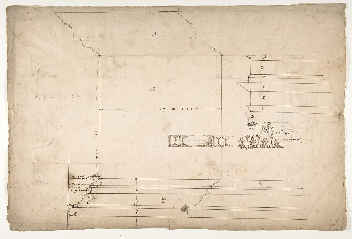 Forum of Nerva, colonnade, profiles of attic and entablature, architrave and column detail (recto) Arch of Constantine, plan (verso)
