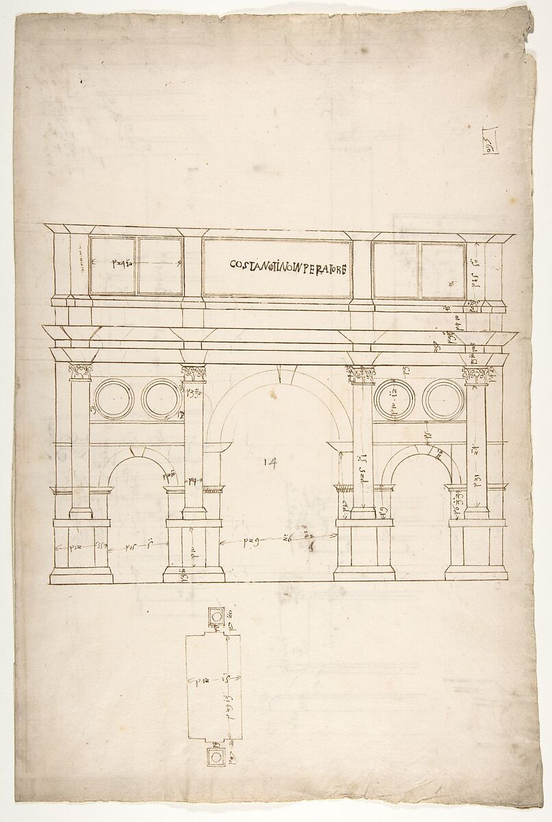 - Title: Arch of Constantine, elev, partial plan (recto) Arch of Constantine, profiles of base, shaft and entablature (verso)