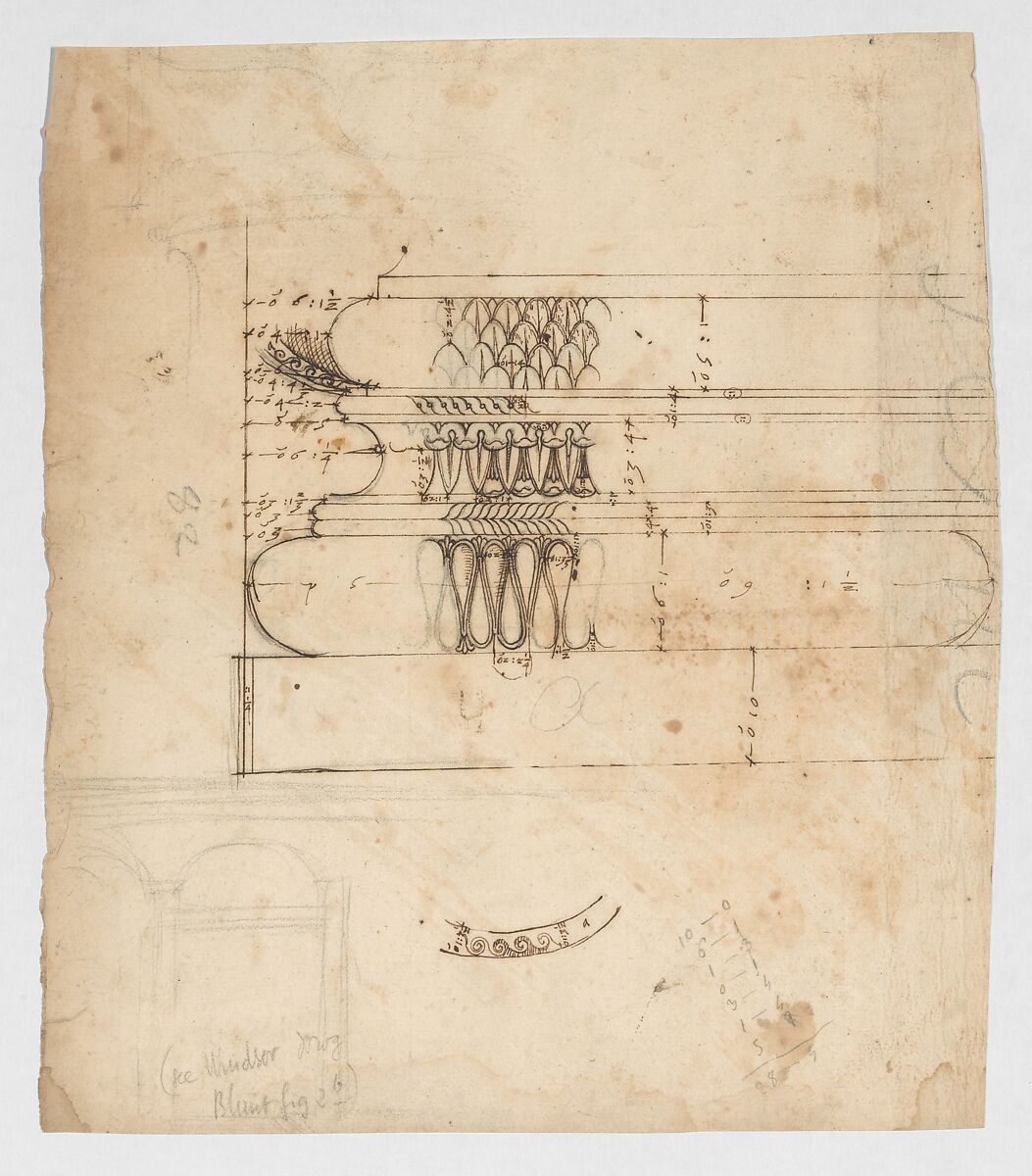 - Title:Forum of Augustus, hemicycle, Attic base, elevation and sculpted detail; Ionic capital, elevation; Palazzo Baldassini, cortile, elevation (recto) blank (verso)