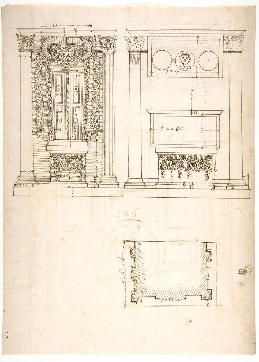 - Title:Unidentified, funerary altar, plan and elevations (recto) S. Giovanni Laterano, Oratorio della Santa Croce, paneling, elevation (verso)