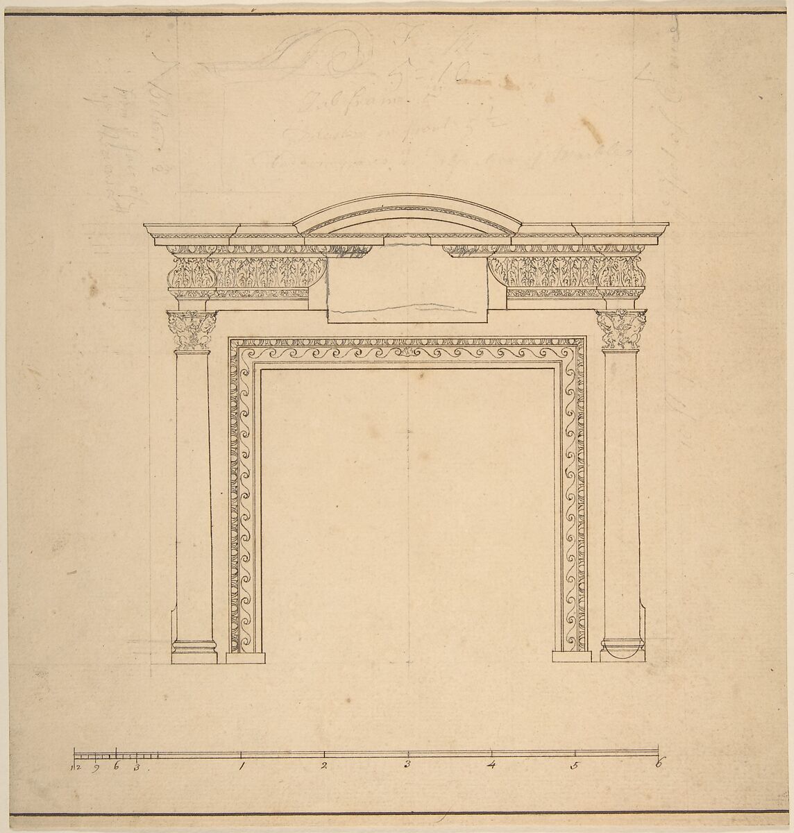 - Title:Design for a Chimneypiece with a Frieze with Floral Decoration and Capitals Decorated with Animals