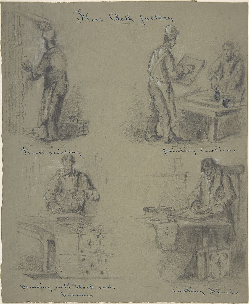 - Title: Four drawings showing the manufacture of floor cloth
