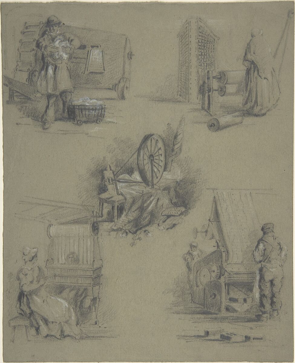 - Title:Five drawings showing processes of weaving and spinning