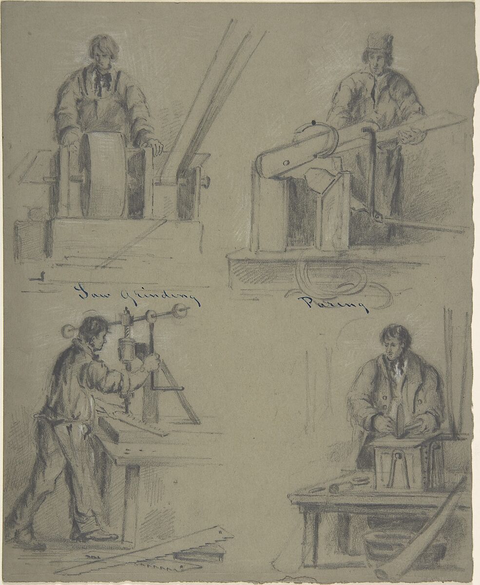 - Title: Four drawings showing the manufacture of saws