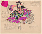 Drawing, design for a captive Portuguese woman's costume by Vincente Minnelli. The costume consists of a dress with pink bodice with long, bell-shaped sleeves with black and purple trimmings and white ruffles, and broad skirt with a pattern of fruits and tropical birds, executed in various colors over a black ground, with purple borders. An opening on the left side of the skirt reveals ruffles of a colored fabric with small floral embellishments of shades of purple and red. The hair is long, curly, and loose, adorned by a headpiece of purple, green, red, and black color. Large, gold hoop earrings and bangles and high-heeled, pointed-toe red shoes complete the outfit. A swatch of fuchsia fabric is attached to the upper-left corner of the sheet.