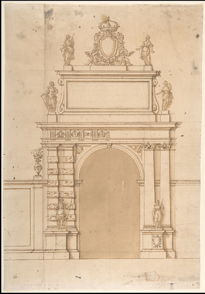 Previously considered anonymous, this drawing has been correctly attributed as by the Milanese architect and author Francesco Maria Richini by Antonio Russo (see Bibliography, Russo 2013), who identified the design with the triumphal entry of Cardinal Ferdinand Hapsburg (1609-1641), "Infante" of Spain, which occurred in 1633 in the Porta Ticinese, the southern gate to the city of Milan.