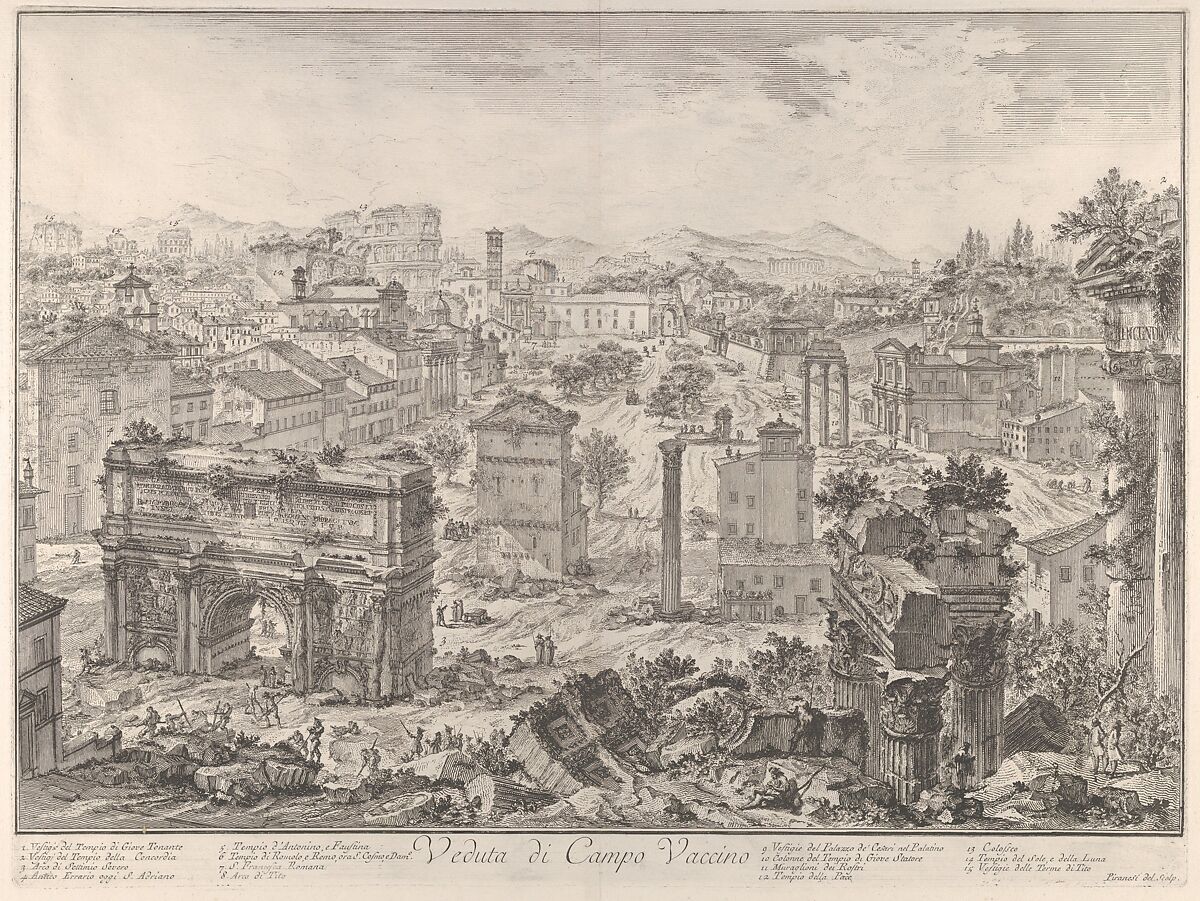 - Title: The Forum Romanum, or Campo Vaccino, from the capitol, with the Arch of Septimus Severus in the foreground left, Temple of Vespian right, and the Colosseum in the distance (Veduta di Campo Vaccino), from "Vedute di Roma"