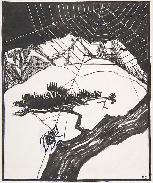 This drawing was made to illustrate "The Fall of the Spider Man," a story in Canadian Fairy Tales, which was based on the folk tales of native Americans and published by the Canadian politician and writer Cyrus Macmillan in 1922. Here, the Spider Man has "said farewell to the Sky Country and let himself down to Earth by one of his own strands of yarn."