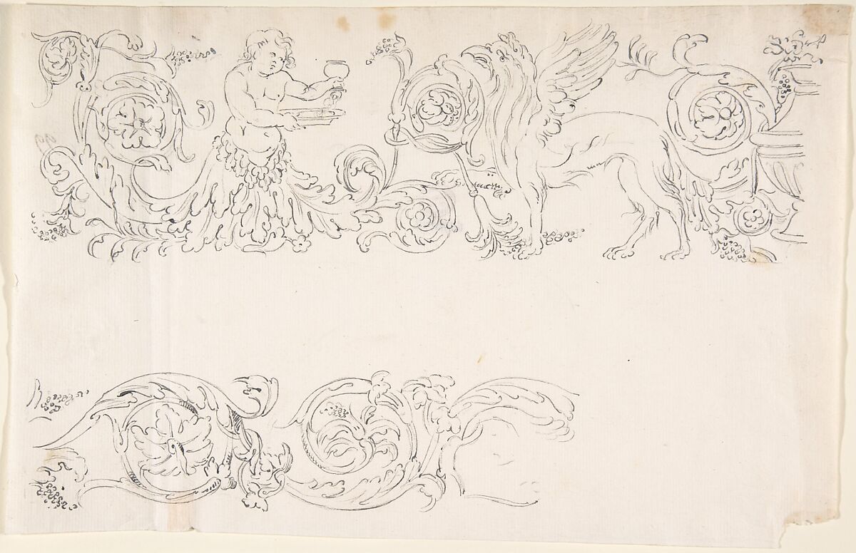 • Title: Designs for Decorative Borders with Floral Ornamentation and a Putto and Griffin