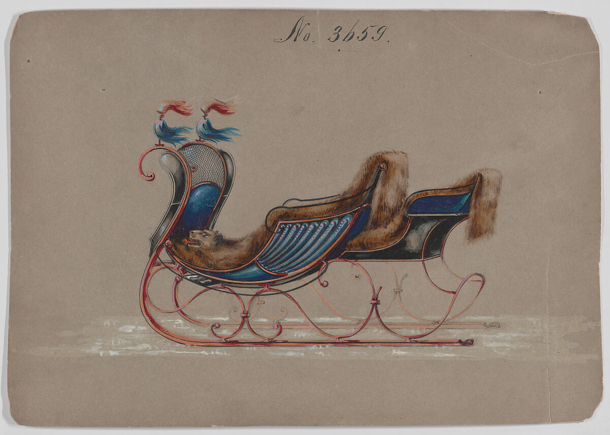 Description by Merri Ferrel who notes: This is one of a series of sleighs designed in the 1880s by Herman Stahmer, the chief designer at Brewster & Co. until his death. He attended Albert Dumont's school in Paris and designed a series of sleighs. He seems to have been influenced by Gmelch who displayed several "Galaschilten" at the Paris expositions.
