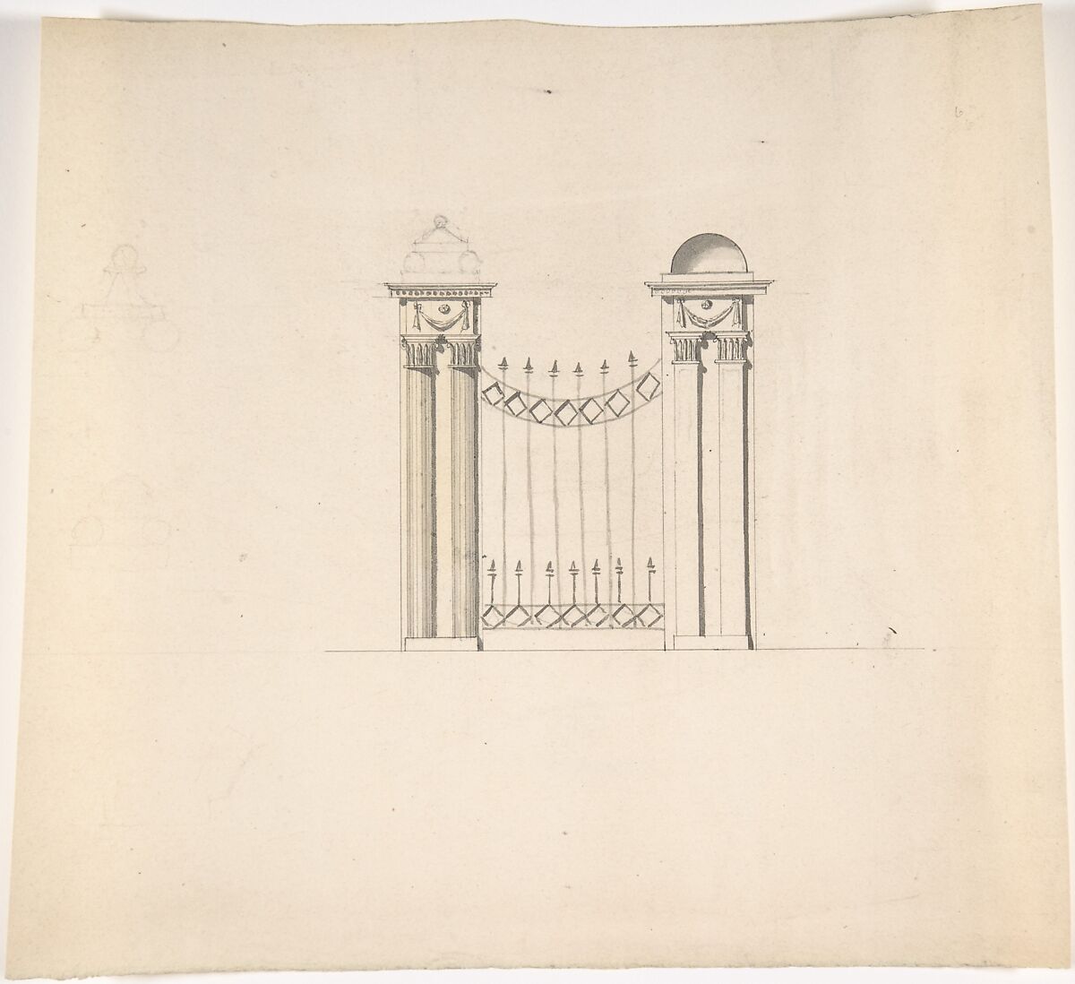 - Title:Design for Gate Piers with Paired Pilasters and Domed Caps, and a Gate