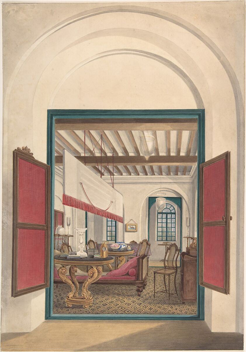 Painted by a skilled unidentified watercolorist, this work records a well-appointed early nineteenth-century room in India during the East India Company period, as viewed from an adjacent veranda. The two pedestal tables with scrolled, gilded legs are likely European imports, while the caned side chairs and low day bed would have been locally made. Swinging half doors and a punkah (a manually operated hanging cloth fan) encourage air circulation, and tall glass candle shields protect flames from drafts. Arranged to serve multiple functions, this room likely accommodated a single man.