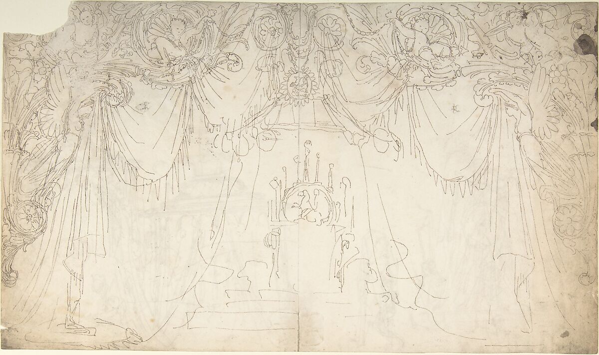 - Title: Design for Bed Alcove (recto); Studies for Statues and Carvings on Bed (verso)