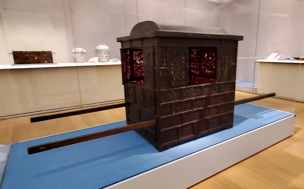 Judging by its size and pink lining, this palanquin, a form of transport for the elite prior to the twentieth century, was probably used by women. A removable domed cover and front panel allow access, while sets of sliding windows, lined to provide privacy, also let the occupant see out through the mesh. The palanquin is carved with auspicious and fantastical imagery ranging from tigers, phoenixes, elephants, and camels to peacocks, peonies, camellias, and grapes. By the mid-twentieth century, palanquins were used primarily for ceremonial purposes, such as weddings. Today some brides still arrange for a palanquin for portions of the ceremony.