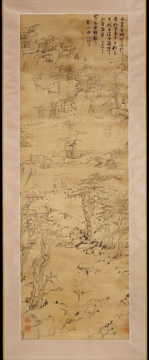 Strolling in a Misty Valley is Mei’s earliest extant work, done shortly after he moved to a new family residence in a scenic area south of Xuancheng. The painting shows him working in the dry, linear style typical of a number of late Ming painters, with angular rock formations and craggy pines loosely organized along a serpentine stream. Its style vaguely recalls the landscape forms of Huang Gongwang (1269–1354) and the spare brush idiom of Ni Zan (1306–1374). Painted just five years after the fall of the Ming dynasty, its allusions to these recluse-artists, who lived under the Mongol Yuan dynasty, clearly signal Mei’s own situation and loyalist sentiments.