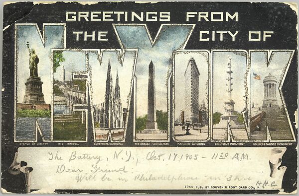 Souvenir postcard, showing the Statue of Liberty, High Bridge, St. Patrick's Cathedral, Cleopatra's Needle, Flatiron Building, Columbus Monument, and Soldier and Sailors Monument, inside the letters of NEW YORK. (Album 405, page 60)