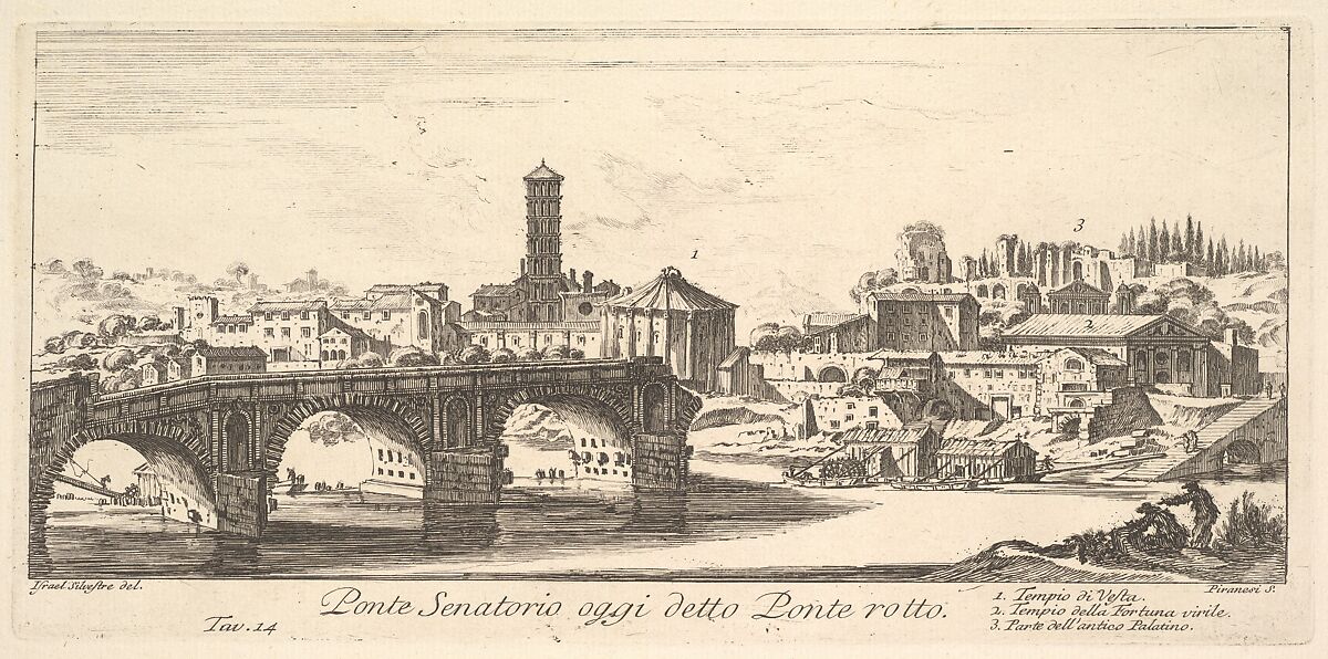- Title: Plate 14: Senatorial Bridge, today called the Ponte Rotto (Broken Bridge). 1. Temple of Vesta. 2. Temple of Fortuna Virilis. 3. Part of the ancient Palatine. (Ponte Senatorio oggi detto Ponte rotto), from "Antichità Romane de' Tempi della Repubblica, e de' primi Imperatori"