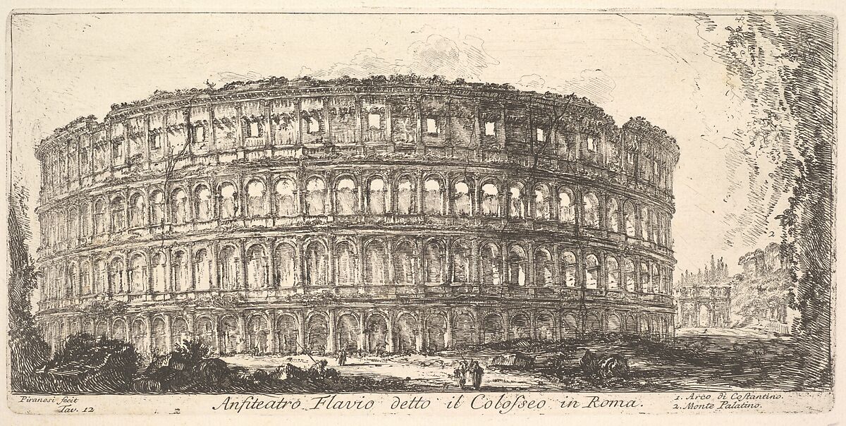 - Title: Plate 12: Flavian Amphitheater, called the Colosseum. 1. Arch of Constantine. 2. Palatine Hill. (Anfiteatro Flavio detto il Colosseo in Roma. 1. Arco di Costantino. 2. Monte Palatino.), from "Antichità Romane de' Tempi della Repubblica, e de' primi Imperatori"