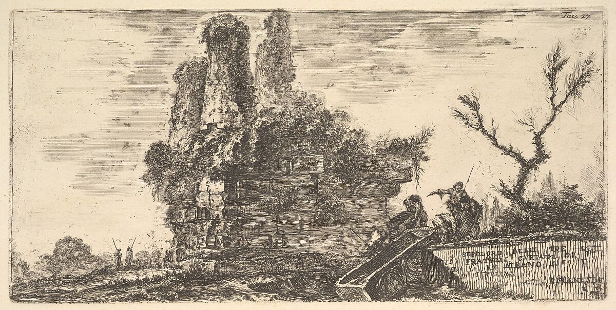 - Title: Plate 27: Tomb of the three Curiatii brothers in Albano (Sepolcro delle tre fratelli Curiati in Albano), from "Alcune Vedute di Archi Trionfali ed altri monumenti inalzati da Romani parte di quali se veggono in Roma e parte per l'Italia" (Some Views of Triumphal Arches and other monuments erected by the Romans, some of which are in Rome and some elsewhere in Italy)