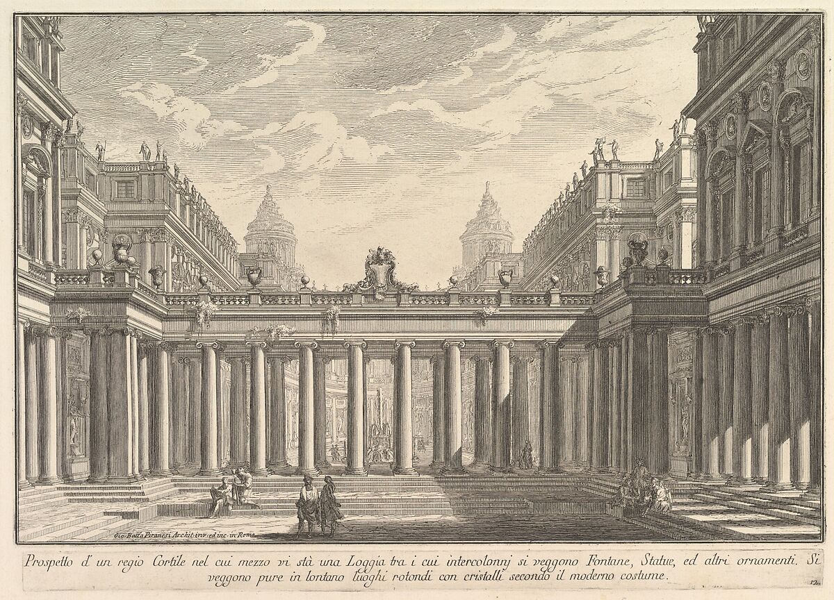 - Title:View of a courtyard with a loggia, fountains, statues, and other ornaments (Prospetto d'un regio Cortile nel cui mezzo vi stà una Loggia...), from "Prima Parte di Architettura, e Prospettive"