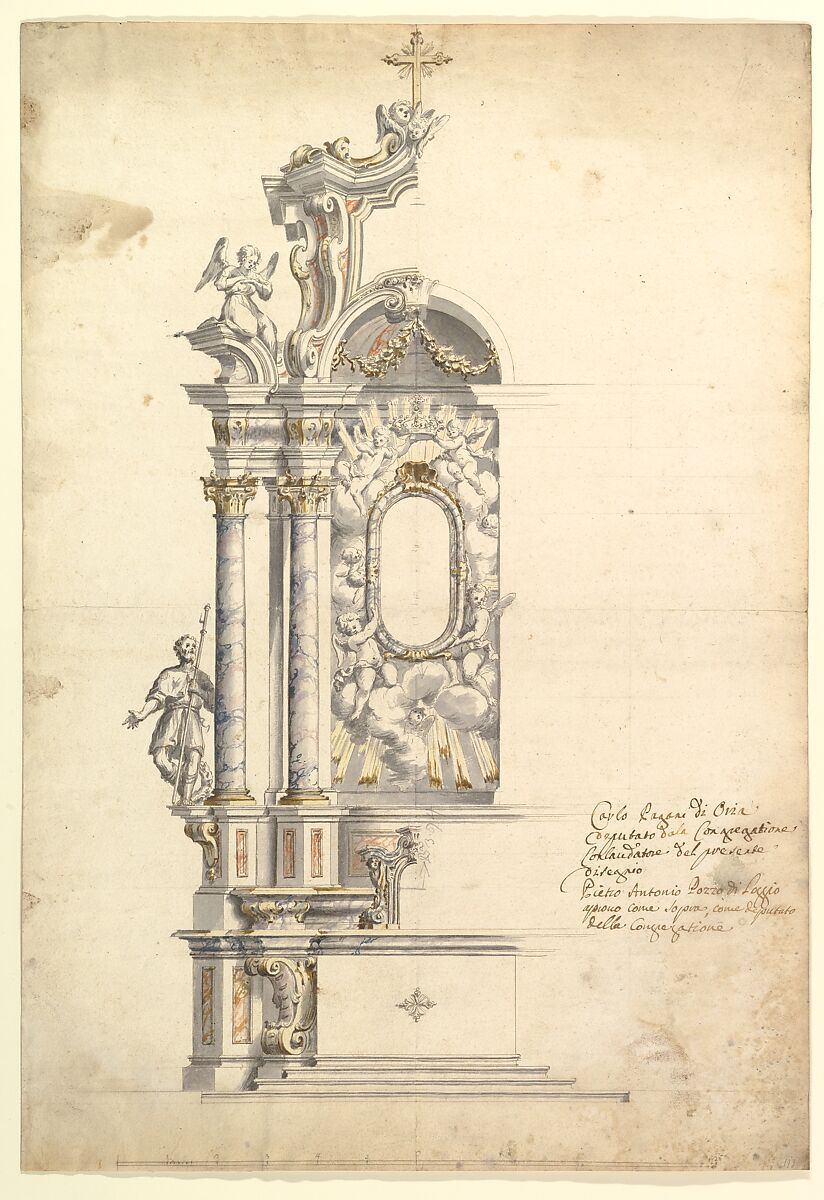 - Medium: Pen and brown ink, brush and gray wash with watercolor, over leadpoint or graphite, with ruled and compass construction; scale, at bottom, in pen and brown ink