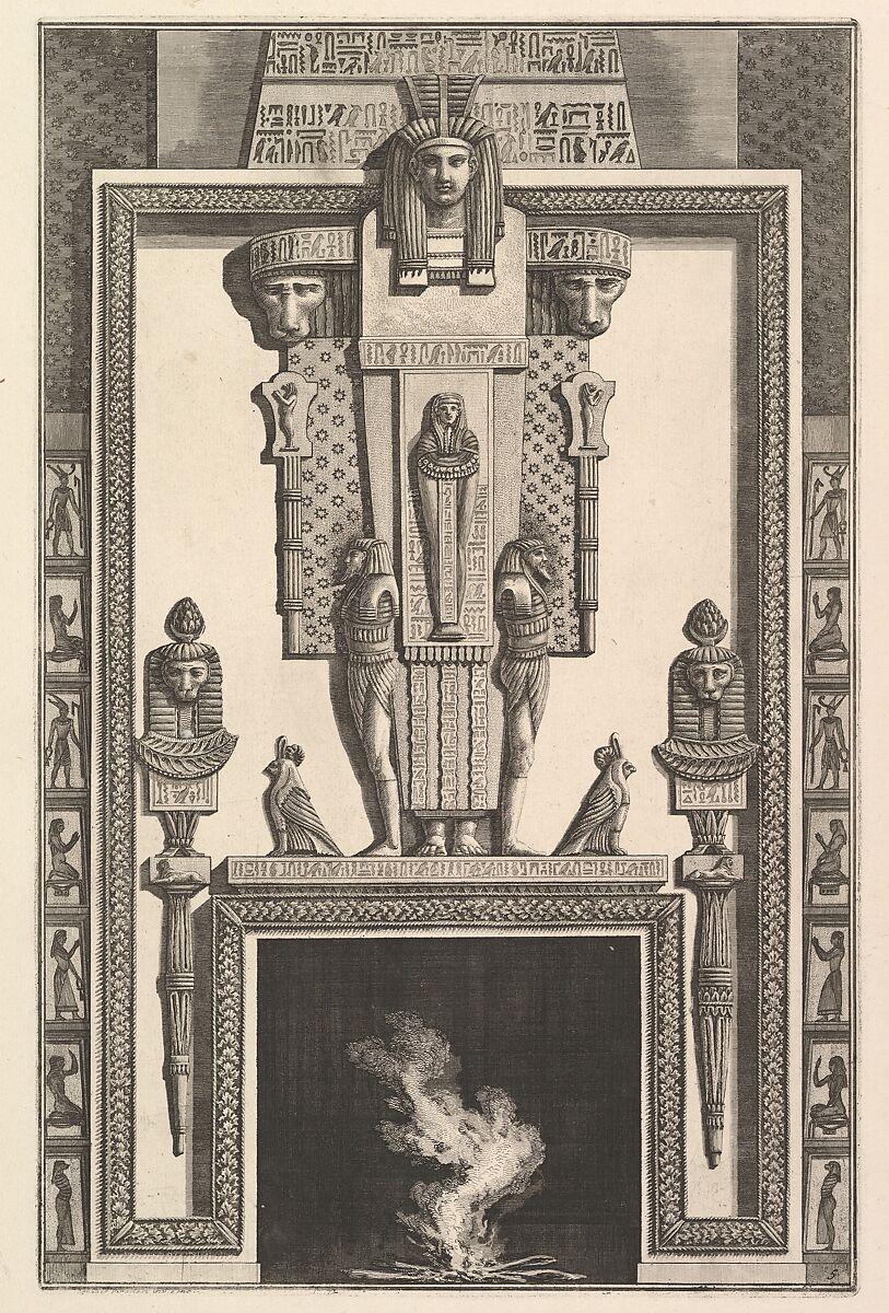 - Title: Chimneypiece in the Egyptian style: Mummy superimposed on a large caryatid above the lintel (Ch. à l'égyptiennne surmontée d'une grande cariatide contre laquelle s'applique une momie), from Diverse Maniere d'adornare i cammini ed ogni altra parte degli edifizi...(Different Ways of ornamenting chimneypieces and all other parts of houses)