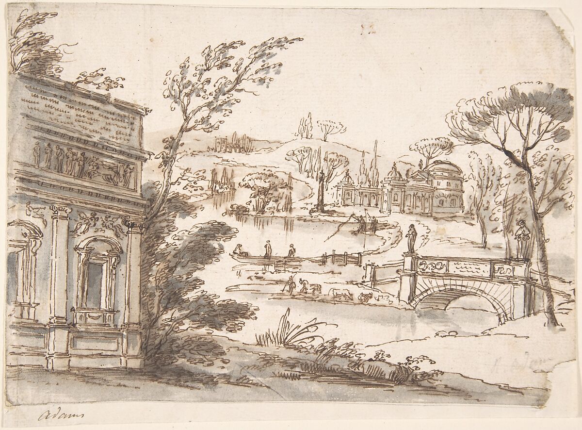 - Title: Classical Landscape with Temples (recto); Indecipherable sketch, possibly of a seated figure (verso)