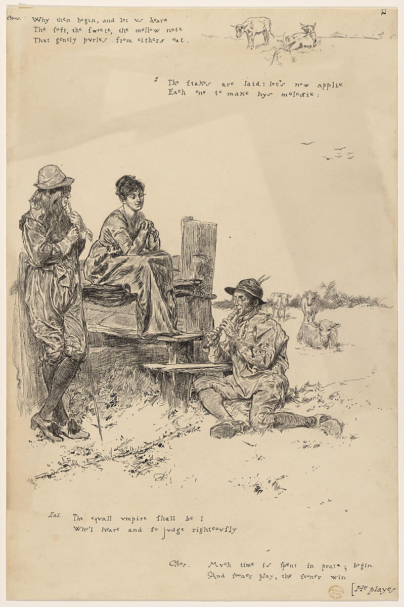 In 1878, Harper & Brother sent Abbey to England to research and illustrate verses by the seventeeth-century lyric poet Robert Herrick. Wood engravings based on the artist's drawings began to appear in Harper's "New Monthly Magazine" later that year, and a group were then published in "Selections from the Poetry of Robert Herrick" (New York and London, 1882; MMA 23.78). This design responds to Herrick's "Bucolick, or Discourse of Neatherds," with the related series of illustrations found in the book.