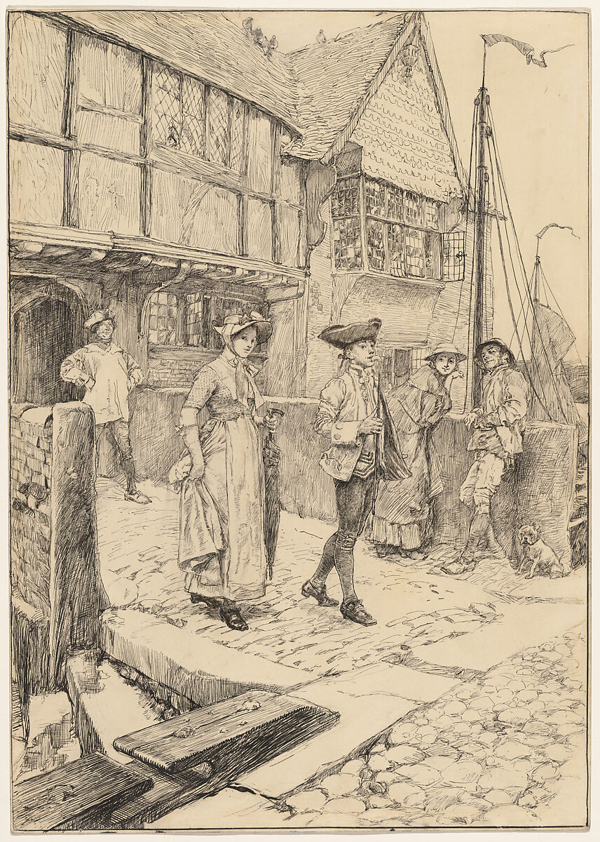 Abbey moved to England in 1878 to research illustrations to historical poems for Harper's and settled there permanently in 1883. This is one of a series that responds to an eighteenth-century ballad by the British poet Henry Carey. The apprentice who narrates the poem has put on his Sunday best to escort the young woman he adores along a cobblestone street. The related stanza reads: