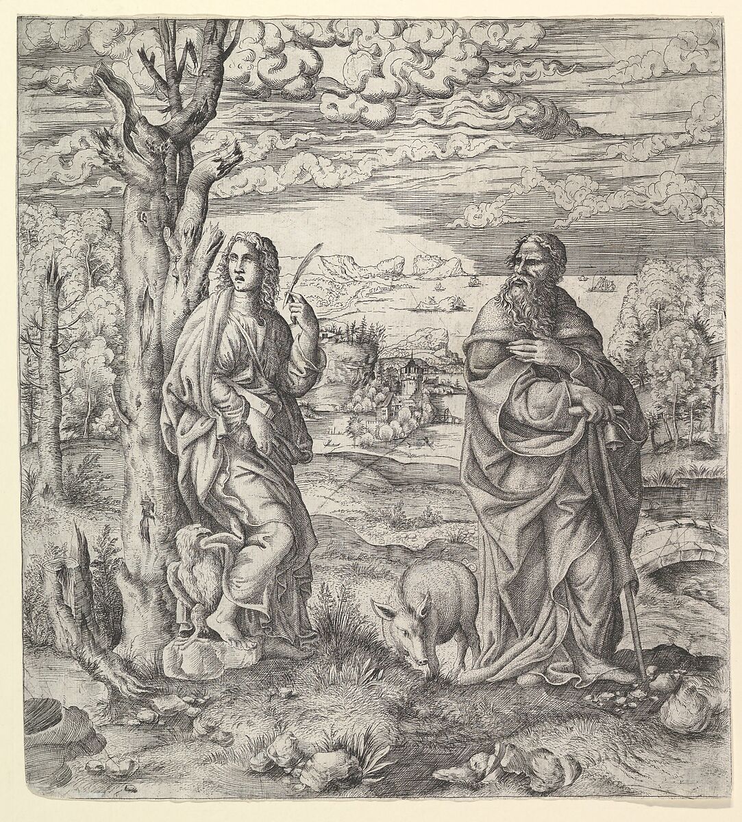 Master I°+V was one of a handful of printmakers working in the 1540s at the palace of Fontainebleau, just outside of Paris. Typical of the master's technique, he combined designs by different artists to produce this extraordinary image. He copied the figures of the two saints from the Mantuan artist Giulio Romano. To create the landscape, he extracted multiple motifs from three prints by Albrecht Dürer. The two trees on the left and the stone bridge on the right were copied from Dürer's engraving of Saint Eustace (exhibited nearby).