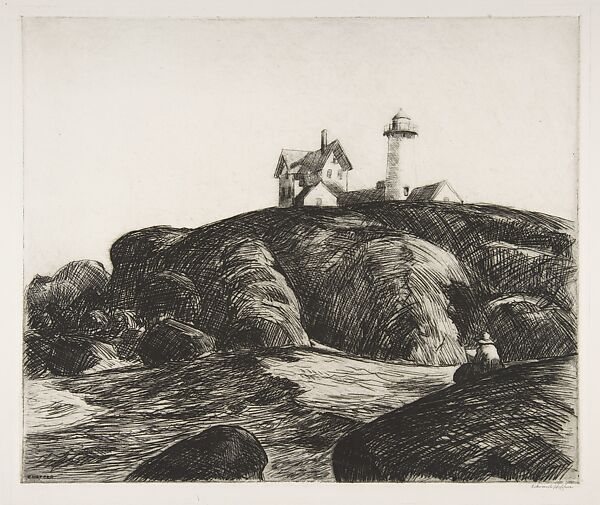 This print likely represents the Eastern Point Lighthouse at Gloucester, Massachusetts, which Hopper painted in watercolor in 1923—the steep view from below here obscures much of the complex. The artist produced about 70 etchings between 1915 and 1923. After returning to New York from Europe in 1910, he explored this new medium when his paintings failed to find buyers. In addition to subjects inspired by rural New England, Hopper evoked memories of France, and showed men and women experiencing the distinct urban fabric of New York. After receiving two awards for his prints in 1923—the Logan Prize from the Chicago Society of Etchers and the W. A. Bryan Prize—Hopper refocused his energies on painting, but often returned to subjects he had used etching to shape.
