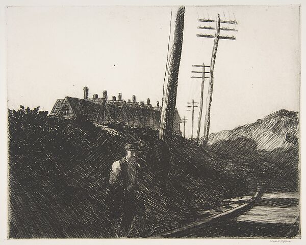 In this unsettling image, a man steps out onto railroad tracks, with the deep bank and indistinct shadows suggesting possible danger. The artist had returned to New York from Paris in 1910 and took up etching when his paintings failed to find buyers, producing about 70 prints between 1915 and 1923. In addition to depicting men and women experiencing the urban fabric of New York, he evoked memories of France, and explored rural and coastal landscapes in Maine and Massachusetts. After Hopper received two awards for his prints in 1923—the Logan Prize from the Chicago Society of Etchers and the W. A. Bryan Prize—he refocused his energies on painting, but often returned to subjects he had used etching to shape.