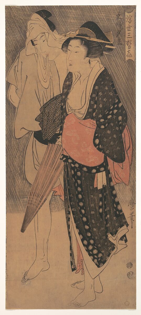 The title of the series reveals that it parodies three evening scenes from the early-thirteenth-century anthology Shinkokin wakashū. The scenes are of sunset, the cool of twilight, and an evening rain. This image displays an appreciation of ordinary aspects of daily life, capturing the moment that the couple sets out in the rain, he tucks up his robe, and she prepares to open her umbrella.