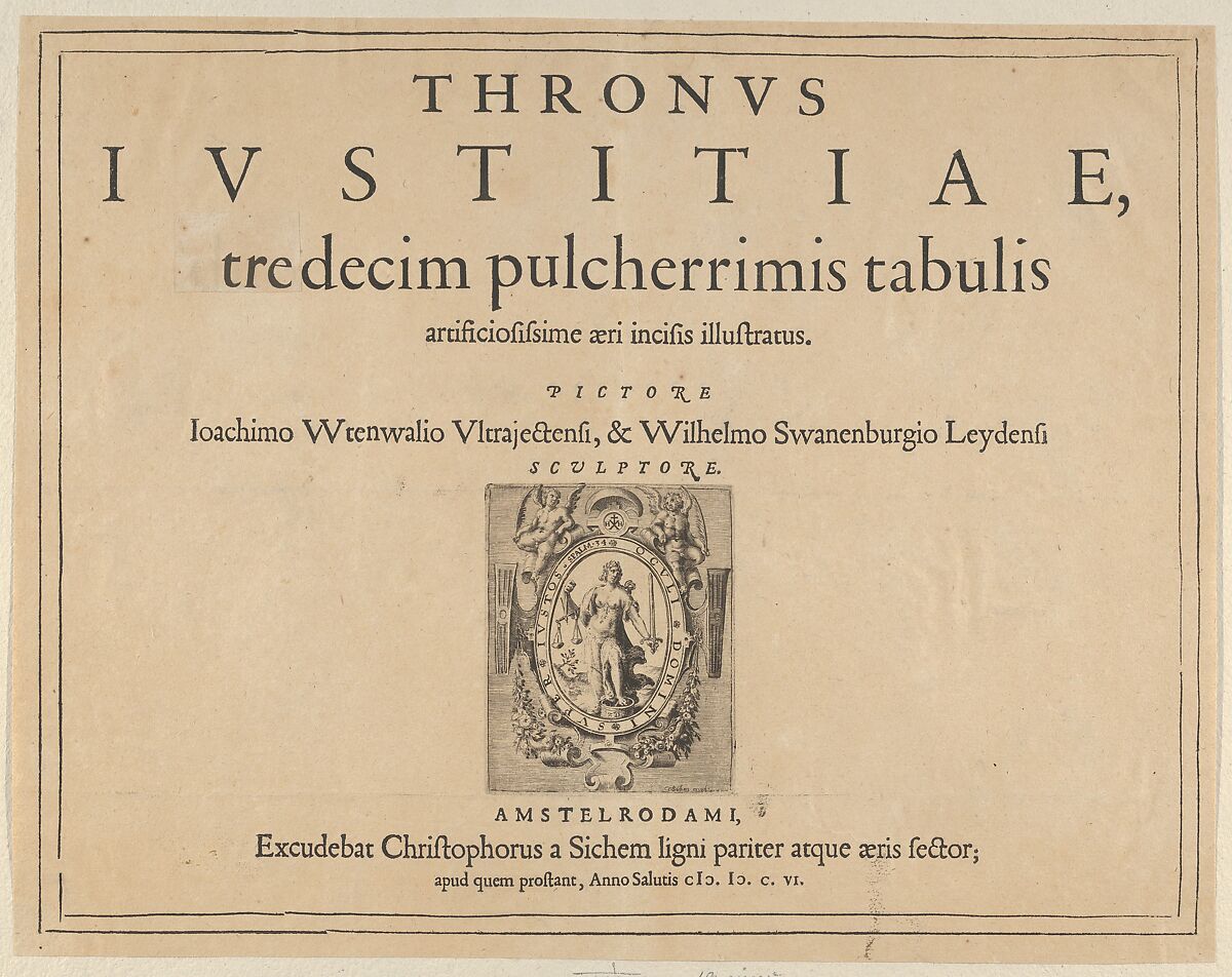 This print is from a set of 13 plates depicting "pictures of justice", with scenes from the Bible, history, and legend. The prints are executed by Willem Swaneburg after designs by Joachim Wtewael. The prints were first published by Christoffel van Sichem in 1606. This print is the typographic title page, which is not described by Hollstein, who only includes the engraved tite page depicting King David and Solomon. This title page incorrectly states the number of plates as twelve, but a sheet of paper has been pasted on top of the first part of the word "duodecim," correcting it to read "tredecim."