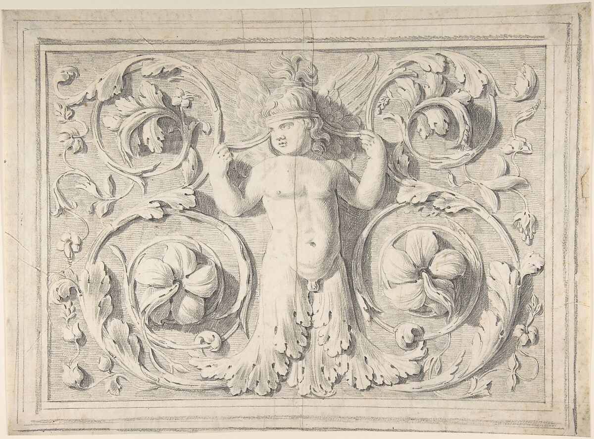 - Title: Antique Roman Sculpture with Nude Winged Boy at the Center and Leaves and Vines