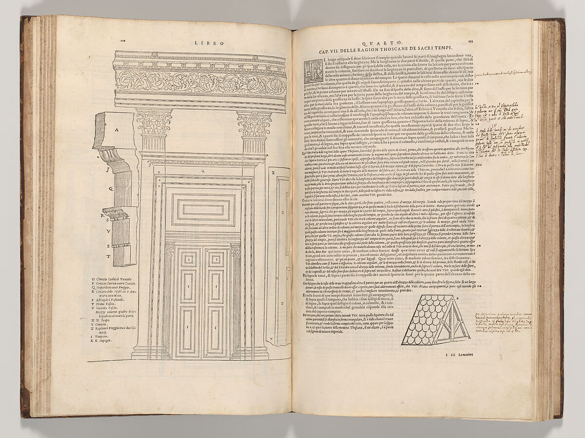 The ten books of architecture by Marcus Pollio Vitruvius are the only text devoted to the art of building that remained from Roman Antiquity. The text was a great resource for Renaissance artists and architects who wished to learn and apply the Antique principles for their modern constructions. Initially, the text was hard to access, however, as it was written in Latin and was unillustrated. During the fifteenth century the first vernacular translation appeared in Italy, and in 1511, Fra Giovanni Giocondo published the first illustrated edition of the text. Vitruvius’ text became a point of reference for all subsequent architectural treatises and as such, the genre of Renaissance architecture publications is marked by a high level of inter-referentiality. This specific copy of Daniele Barbaro’s translation of Vitruvius is a very special case, however, as the text was (partially) illustrated by the well-known architect Andrea Palladio, who later published his own architectural treatises, and the book was owned by his direct successor, the architect Vincenzo Scamozzi.