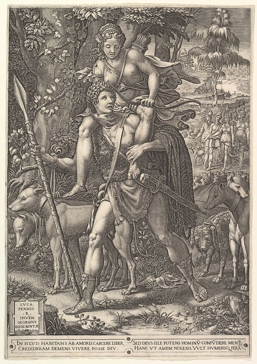 - Title: Allegory of the Hunt; a hunter holding a large spear carrying a woman (Diana?) on his shoulders; five hunting dogs in the foreground and a retinue of male and female hunters in the background