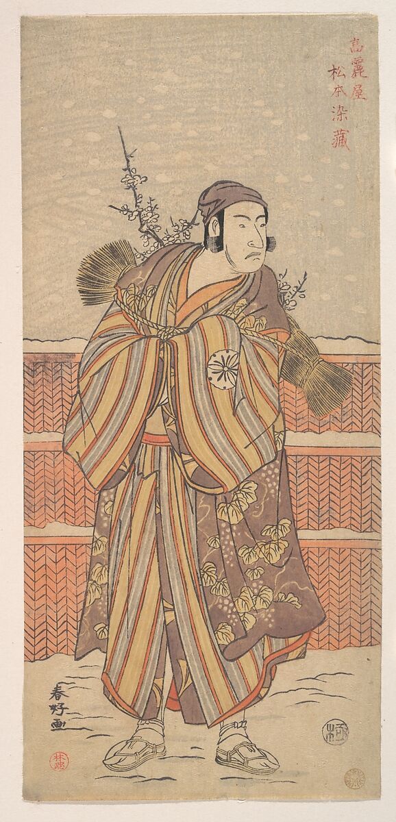 Actor Matsumoto Sumezō carries a rolled straw mat slungacross his back and a branch of plum blossoms, the first flowers of spring.