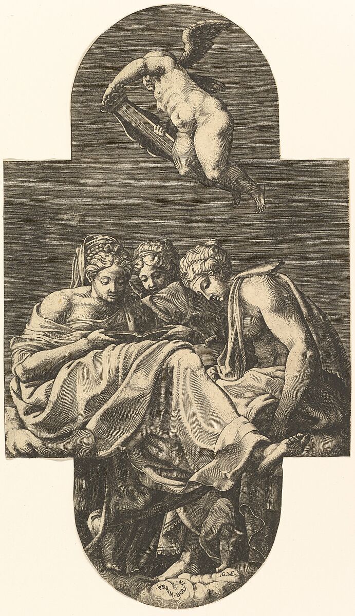 - Title: Three Muses and a putto above with a lyre, from a series of eight compositions after Francesco Primaticcio's designs for the ceiling of the Ulysses Gallery (destroyed 1738-39) at Fontainebleau