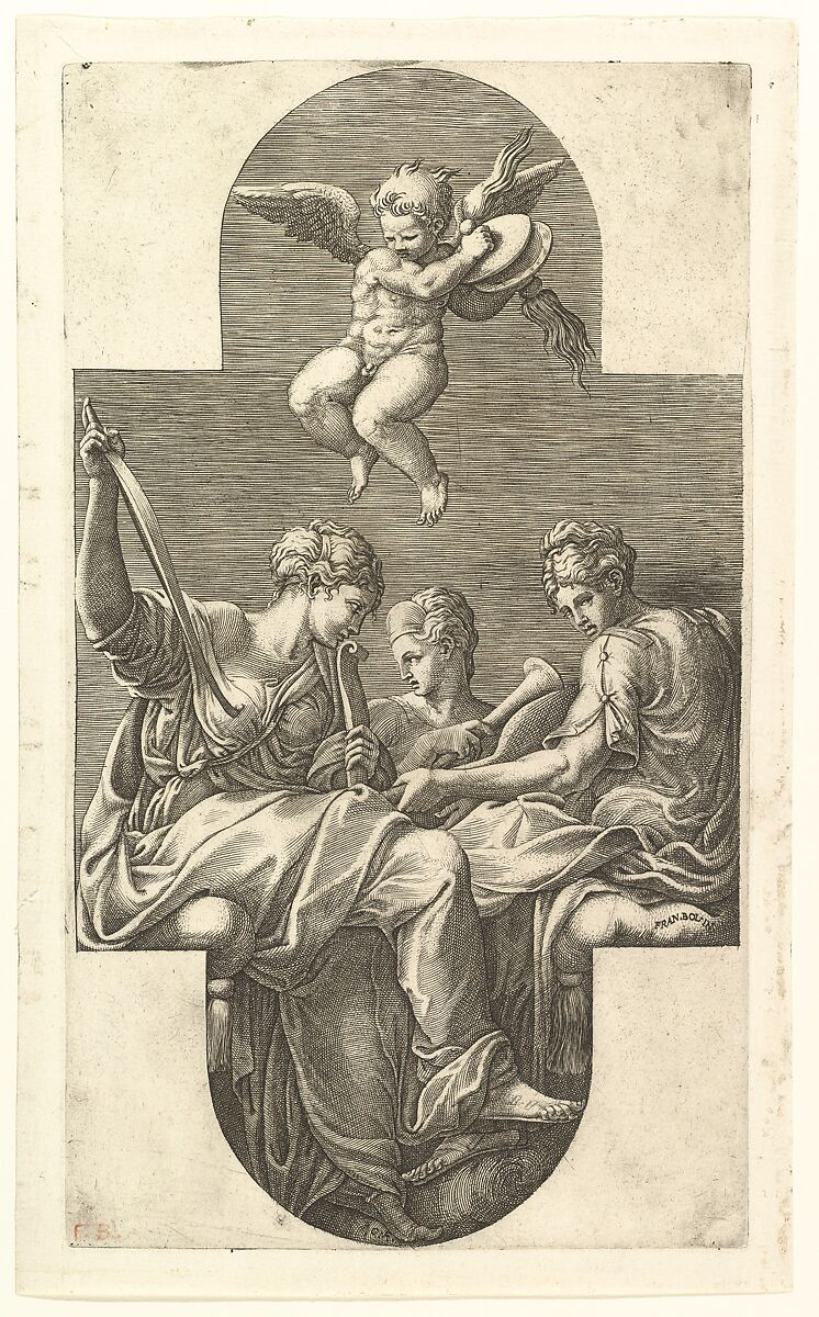 - Title:Three Muses and a Putto with Cymbals, a cruciform composition, from a series of eight compositions after Francesco Primaticcio's designs for the ceiling of the Gallery of Ulysses (destroyed 1738-39) at Fontainebleau