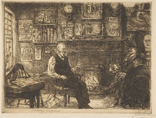 Portrait of John McSorley and two friends at McSorley's Old House and Home. McSorley died before Sloan ever visited the bar – the print is based on a memory told by his son of his father always sitting there in the sun, see: Morse 1969, p. 207.