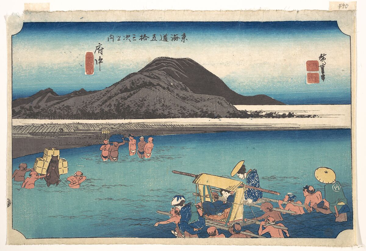 Fuchu, a capital city of Suruga, was a prosperous city where Tokugawa Ieyasu, founder of the Tokugawa shogunate, retired. In this print, three ladies are carried across the Abe River by porters—in a palanquin, in a simple litter, and on the back of a wader.