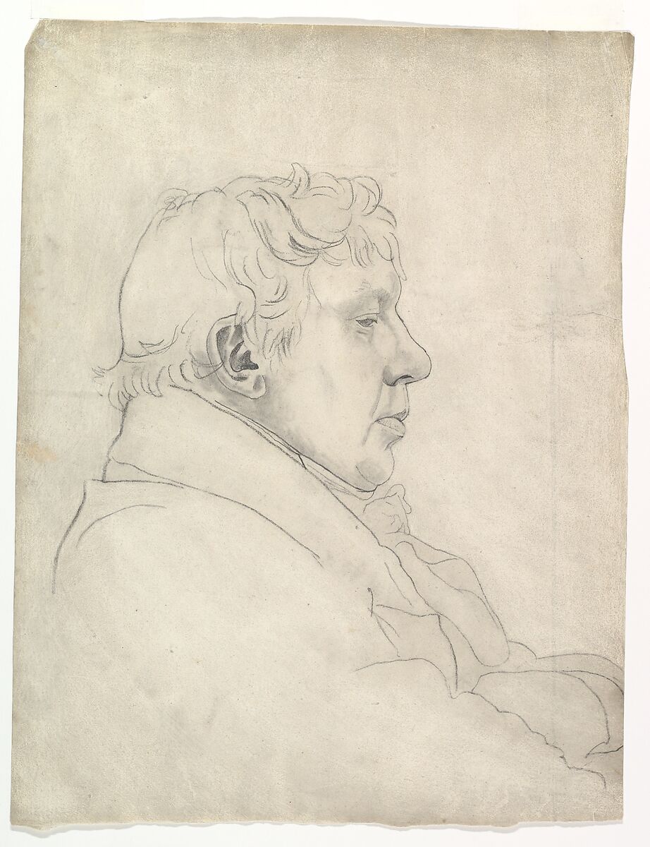 Before photography was invented, artists often used optical tools for assistance. Cornelius Varley, who was a skilled draftsman, watercolorist, and instrument maker, tried the Camera Lucida when it was invented in 1806 but found it wanting. By 1811 he had invented and patented a superior device called the Graphic Telescope. Containing adjustable lenses and mirrors, it does indeed resemble a telescope, but the user looks down into it, keeping both eyes open to see two superimposed images. The subject being studied can thus be compared to a drawing resting below. The instrument proved invaluable as an aid to place objects correctly within a receding landscape, capture intricate nautical rigging, or record a sitter’s features. In this striking portrait of an unknown man Varley used the invention to draw the essential features. He then set the instrument aside and added passages of rubbed chalk to convey volume and project a determined character.