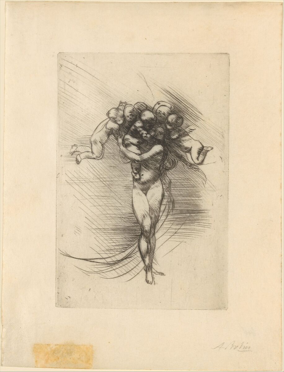 Rodin learned the drypoint technique—a printmaking method that involves drawing with a needle directly on a metal plate—from the artist Alphonse Legros during a visit to London in 1881. The motif of a female figure whose head is encircled by putti appeared first on a vase Rodin designed for the Sèvres porcelain factory, where he worked from 1879 to 1885, though the composition here is most similar to a related porcelain plaque in the collection of the Iris & B. Gerald Cantor Center for Visual Arts at Stanford University.