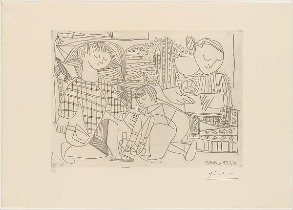 Picasso and the young artist Françoise Gilot began a ten-year relationship in 1943; they had two children together, Claude and Paloma. Happy and absorbed in his new family, Picasso made many images of them, including this tender etching of Françoise with their children at play.