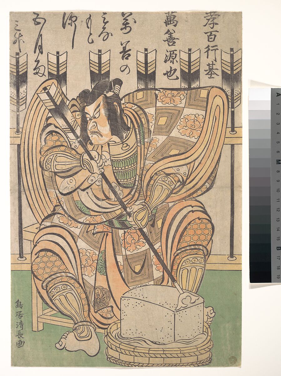 The Torii school dominated the production of prints of Kabuki actors in the eighteenth century. The fourth grandmaster of the Torii school, Kiyonaga, copied this image from a print by Torii Kiyonobu II (1706–1763). The poem at the top of the print was inscribed by Danjūrō V, a contemporary of Kiyonaga. As shown here, Danjūrō II (1688–1758) performs the role of Soga Gorō, a portrayal that made him a superstar as a swaggering aragoto actor. The print captures the dramatic moment when Soga Gorō, sharpening an arrow, has a vision of the danger that threatens his elder brother.
